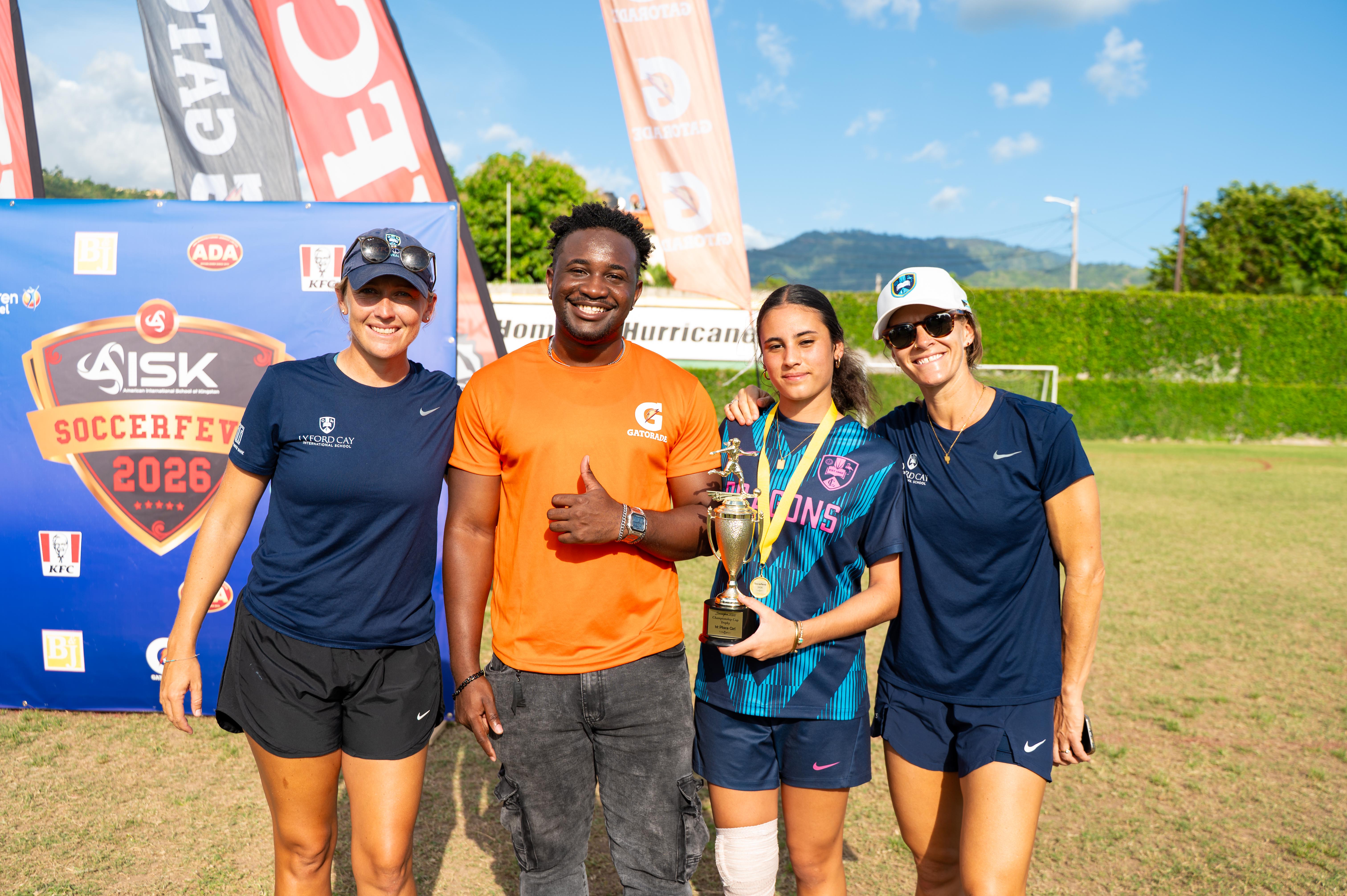 Lyford Cay International School team captain Yasmin Kennedy (second right) celebrates the girls’ championship victory at Soccer Feva 2026 with Coach Annisa Albury (left), Stephan Bennett, Brand Coordinator for Gatorade, and Coach Sarah Ilgenfritz at the American International School of Kingston.