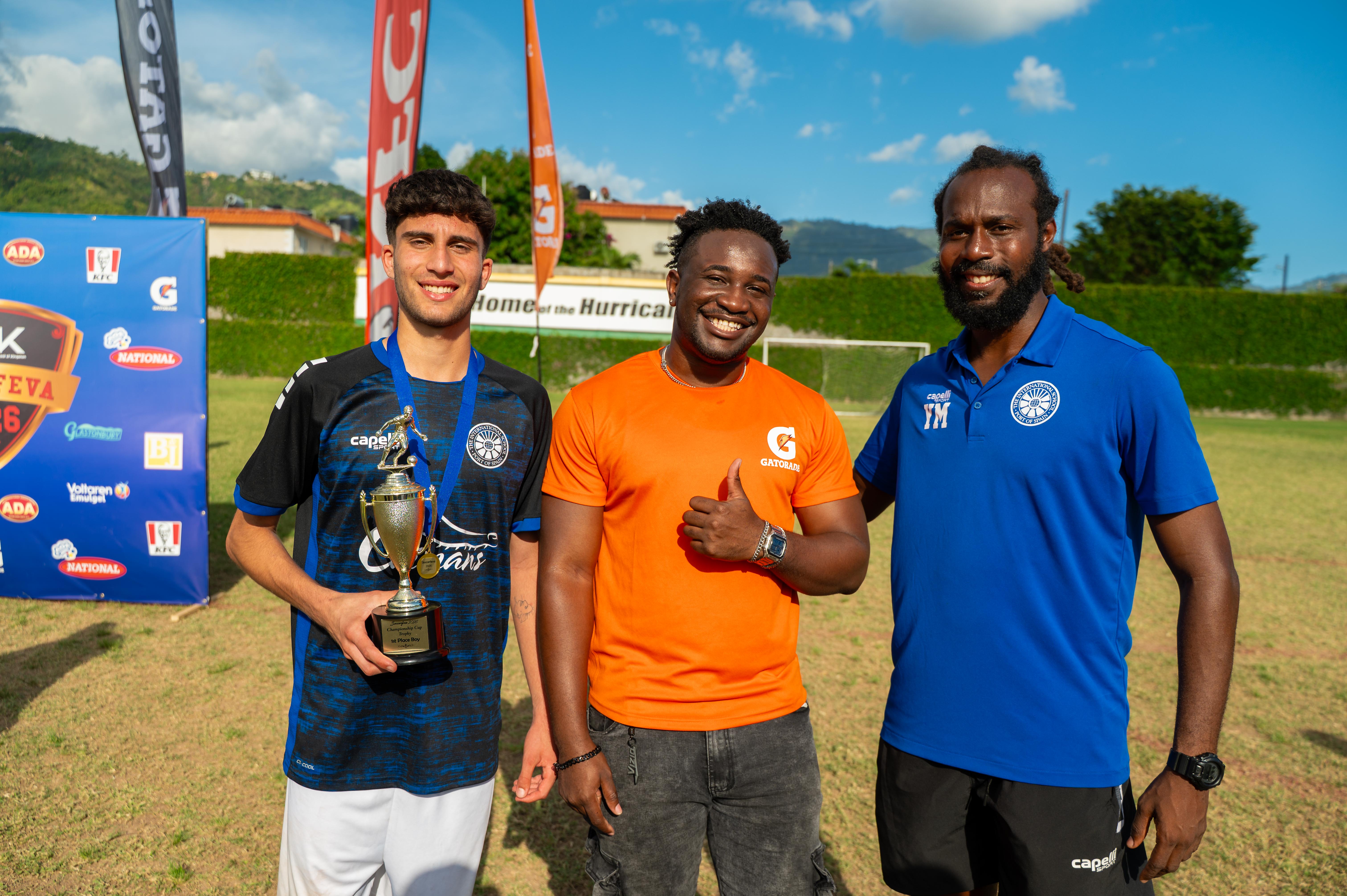 International School of Port of Spain team captain Anthony Mansoor (left) celebrates the boys’ championship victory at Soccer Feva 2026 with Stephan Bennett, Brand Coordinator for Gatorade, and Coach Yohance Marshall.